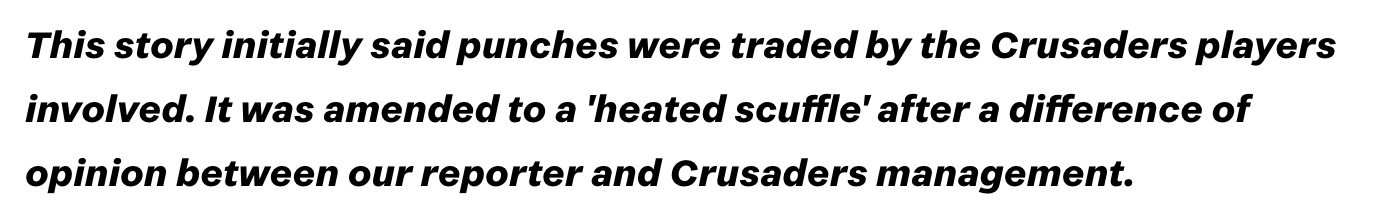 One of the curiosities of the opening month was the appalling start of the defending champion Crusaders, who followed up the loss to their injury-ravaged southern neighbours with a truly awful 24-50 home defeat to the Brumbies. They got their season back on track with a surprising result against the Chiefs, before convincingly falling to the Blues at Eden Park. What followed was some classic training ground biff between prop Kershawl Sykes-Martin and lock Will Tucker. Stuff was there to capture it, which resulted in one of the all-time “eff-you” amendment/ retractions at the top and bottom of their story: